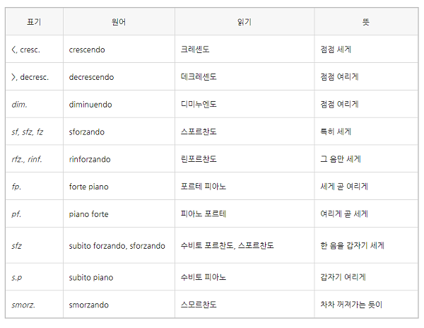 두 번째 표에 있는 셈여림은 작게 시작해서 세게 변화한다던가, 반대로 세게 시작해서