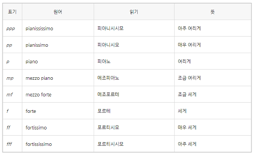 '피아니시모', '포르테' , '피아노' , '메조 포르테' 등이 있는데 초등학교 때부터