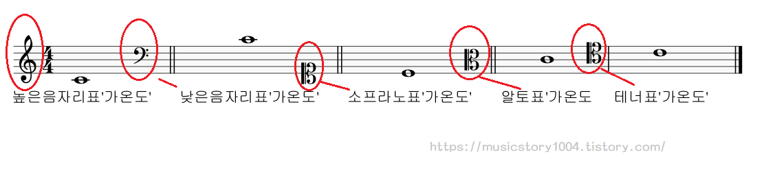 이 '가온도'의 위치를 위와 같이 여러 종류의 음자리표를 사용해 나타낼 수 있습니다.